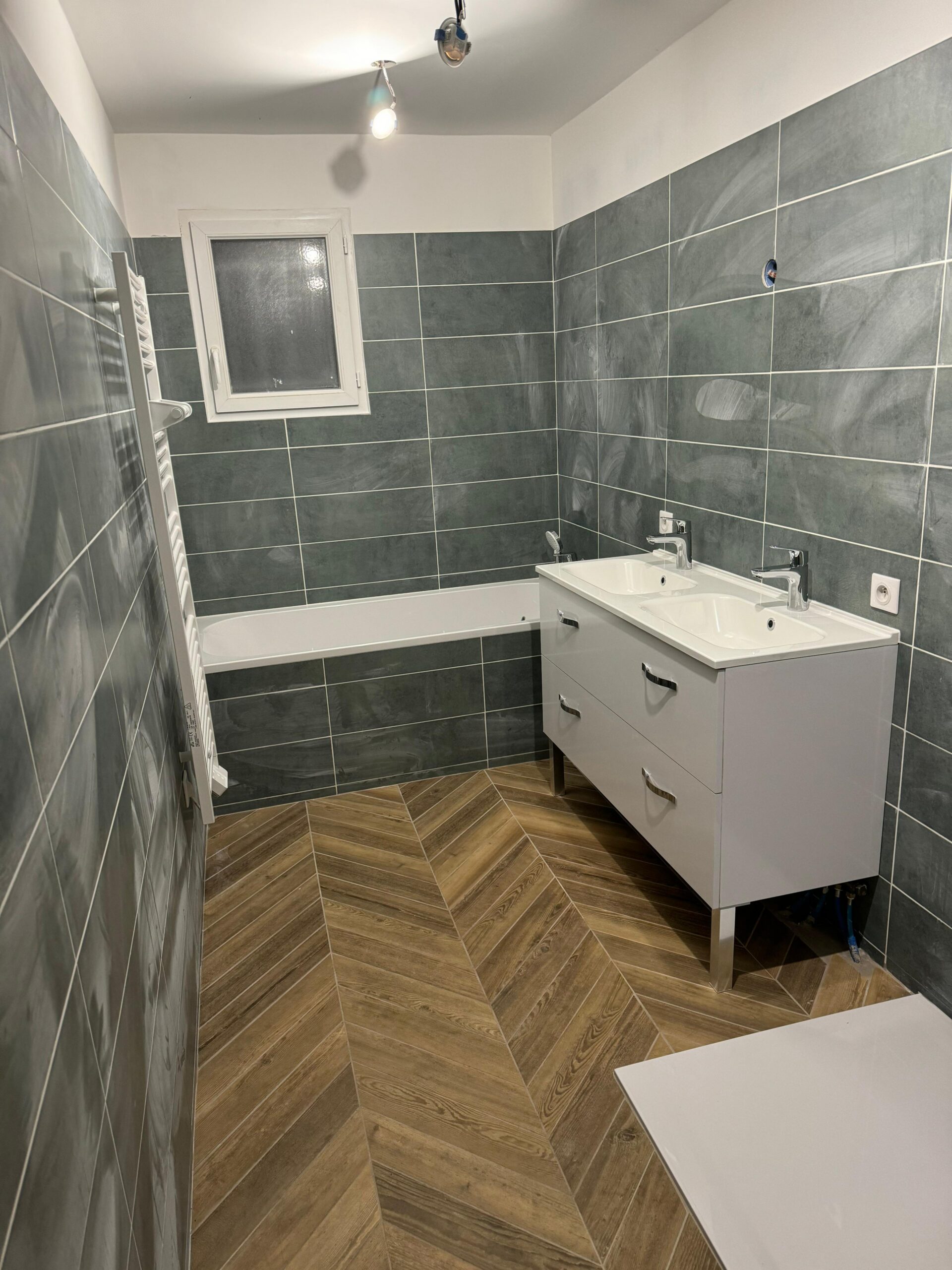 Modernisation complète de la salle de bain : plomberie, sanitaires, carrelage et finitions.